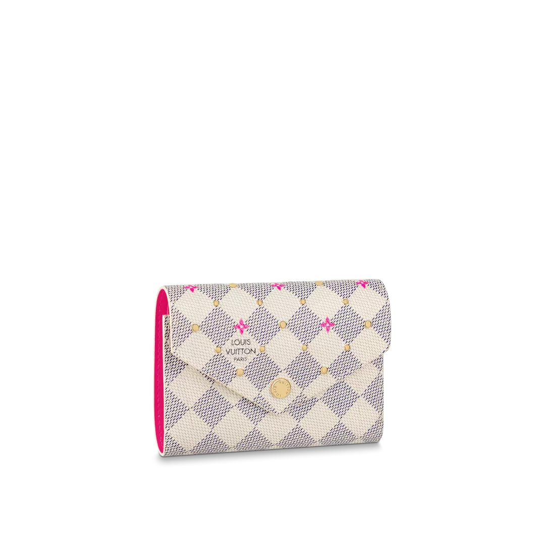 “Portefeuille Victorine” reinterpreted for a special edition of the “Damie Azul Studs” collection. The iconic canvas is decorated with gold-coloured studs and a fuchsia pink floral motif print. When the folded wallet is opened, the pink lining contrasts with a small flap-style wallet. Despite its supremely compact form, it has plenty of pockets and card slots that are equivalent to ordinary wallets.