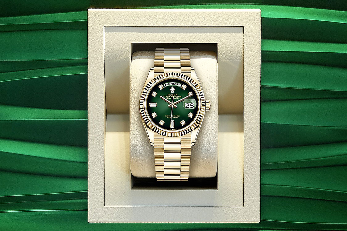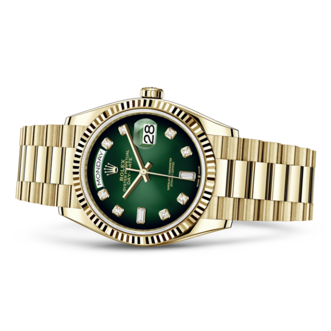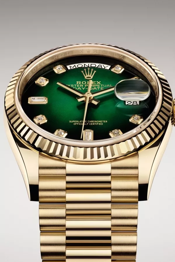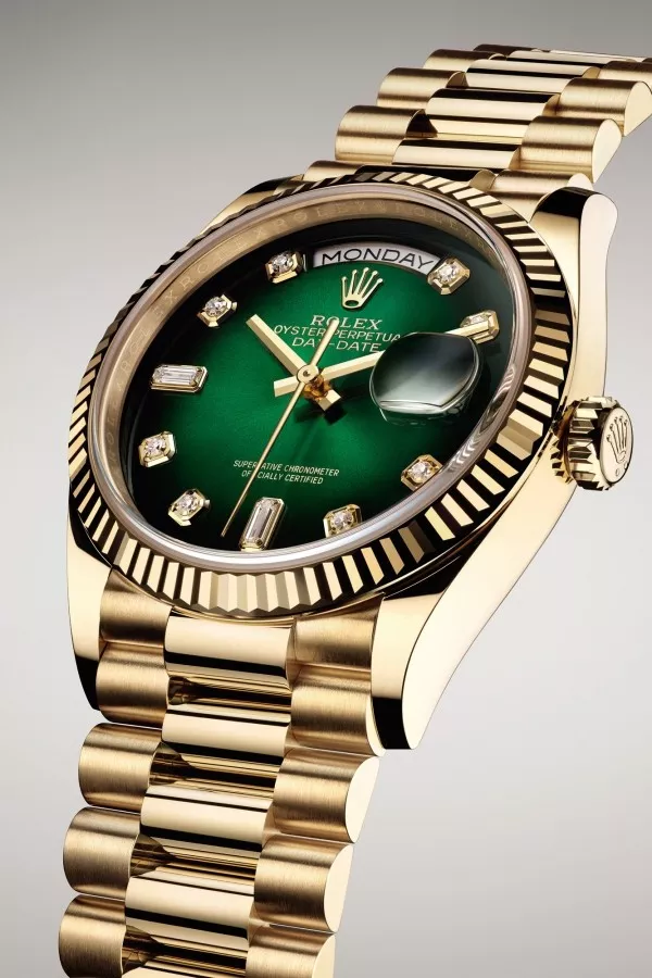 Dial Material: Bright surface, sunlight effect; 18K yellow gold set with 8 diamonds; 18K yellow gold set with two squares in diamonds at 6 and 9 o’clock; 18-carat yellow gold hands